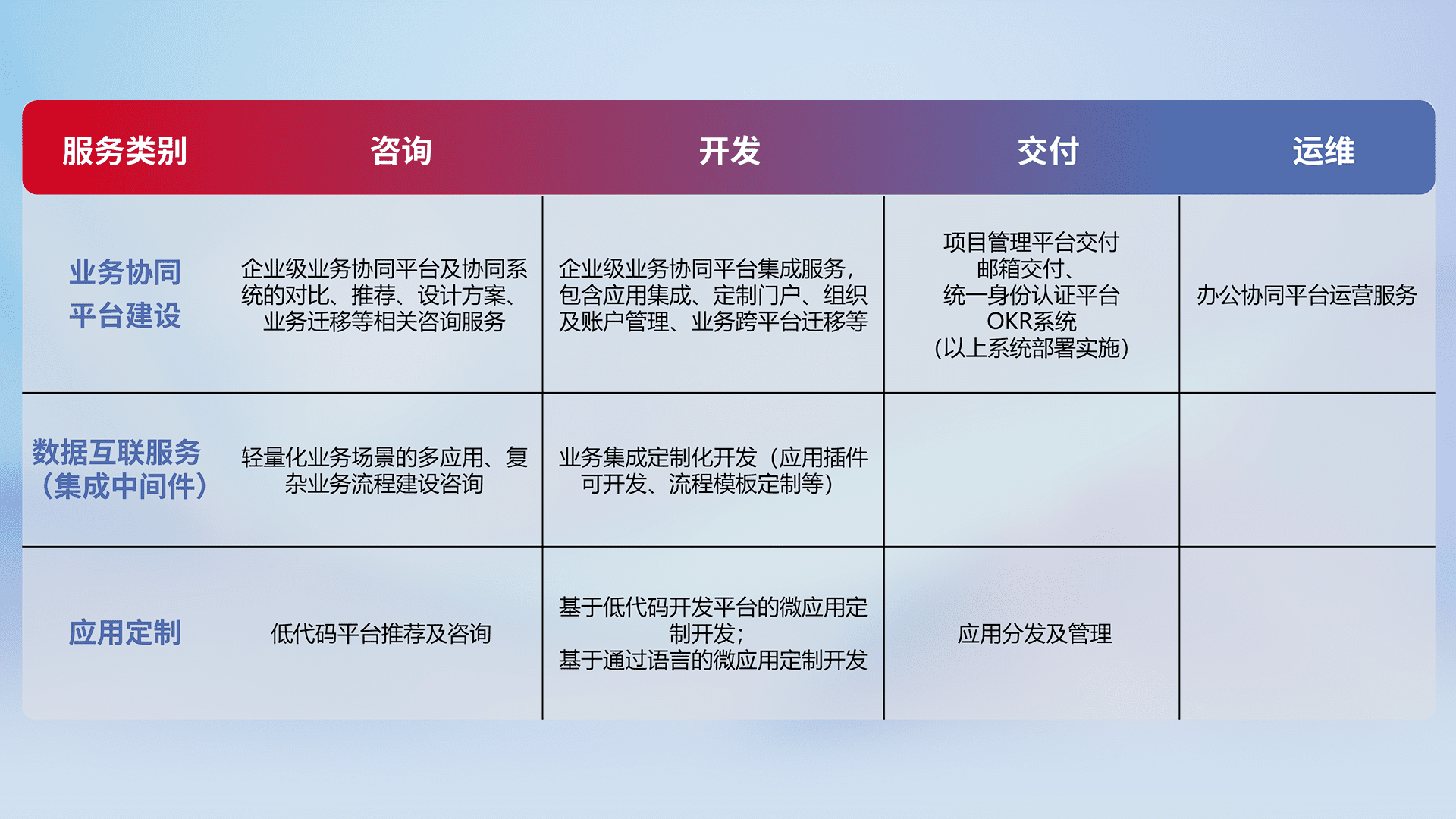 针对钉钉、、、、企微、、、、IDaas等平台级产品提供产品的规划、、、、方案、、、、交付、、、定制化开发等服务,,,,实现如统一协同办公、、、、智能客户服务、、混合会议管理、、、智能数据查询、、、、等业务场景,,,实现数字化转型。。