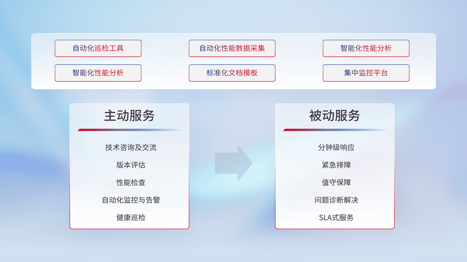 智能化工具和标准化文档,,保障服务质量,,提供主动服务(包含技术咨询、、、版本评估、、、性能检查、、自动化监控与告警、、健康巡检)和被动服务包含(分钟级响应、、、紧急排障、、值守保障、、问题诊断解决、、、、SLA服务)。。。